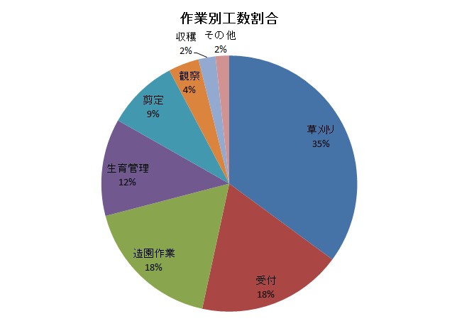 作業別の作業時間を集計すると、一年間、どの作業にどれだけ時間を割いているかが見えてきます。小生の場合には、草刈りに35%の時間を費やし、次いで、2013年から営業開始したブルーベリー観光農園の受付に18%、観光農園の造園作業に18%を費やしているという割合が見えてきました。